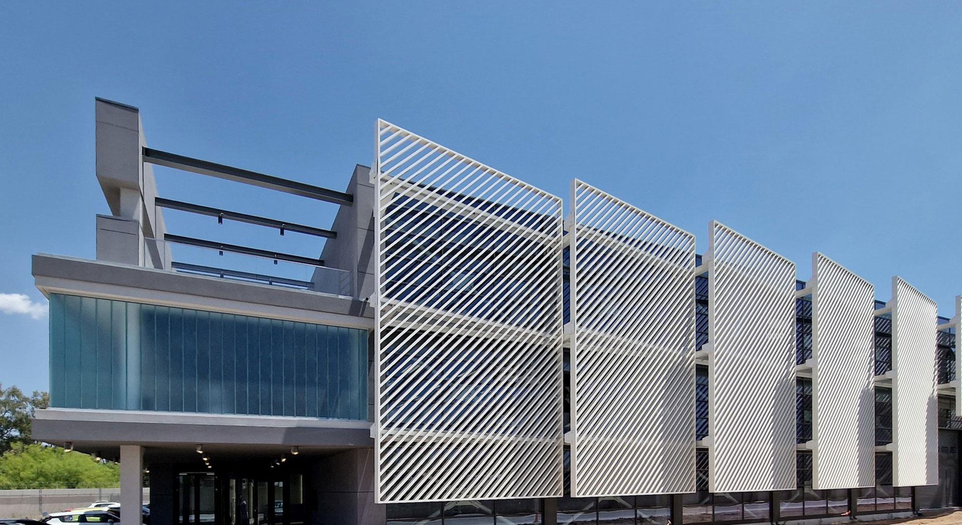 On the north / northwest side of the office building, on the first floor, there is an arched cantilever zone, which is surrounded by vertical aluminum blinds for shading.