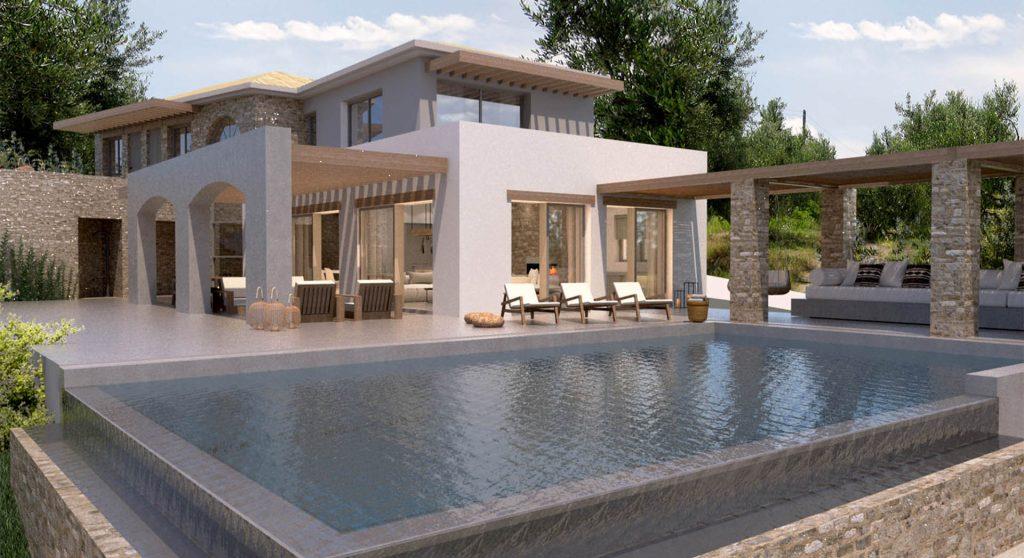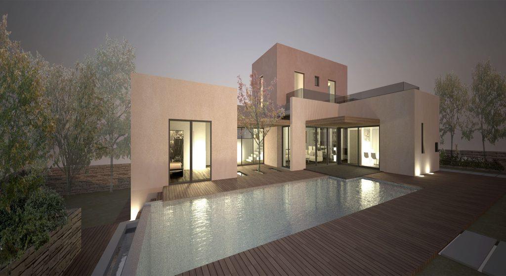 The volumes of the house on Voulgaroktonou Str. in Kifissia, follow a strict geometry and are articulated around a semi-outdoor space that will serve as a pleasant outdoor living area during the summer months next to the swimming pool. The main axis of movement of the house is from north to south, ending at the semi-outdoor space.